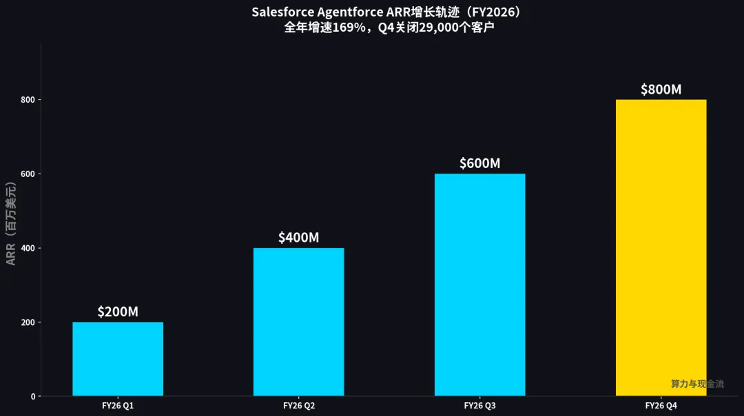 数字验证这套策略有效:Agentforce在FY2026 Q4单季度关闭29,000个客户,全年ARR从约2亿美元增长到8亿美元(增速169%)。数据来源:SaaS Mag引用Salesforce官方投资者关系公告[2]
