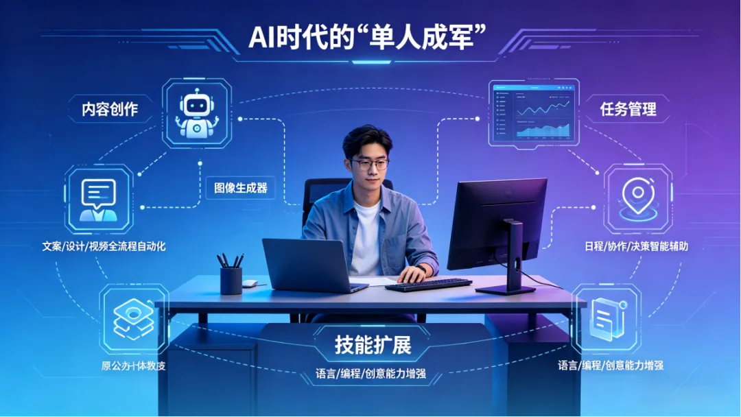 但当下爆火的 OPC,早已超越法律定义,成为一种AI 赋能的超级个体创业形态:一个人,借助 AI 工具、云服务与数字化协作网络,独立完成产品研发、设计、运营、营销、客服、变现等全商业链路,以 "单人" 形态扛起过去需要团队才能运作的公司业务,实现 "一个人就是一家公司" 的商业闭环。