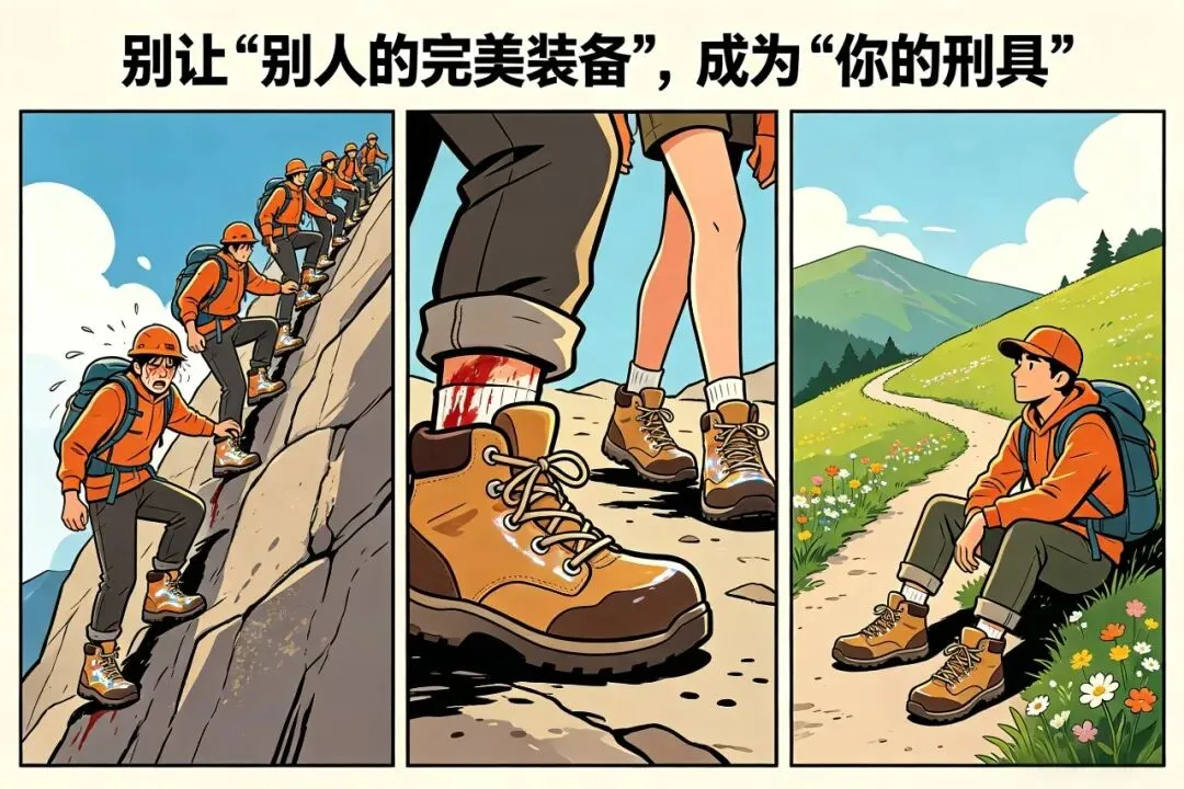 你看,徒步的第一原则,其实是“鞋合不合脚,只有自己知道”。 那套被社会推崇的“完美模板”,就像一双统一尺码的顶级登山靴。它用料扎实,看起来无懈可击,人人都说好。但如果你脚型特别,或者你走的根本不是需要这种靴子的冰雪线路,那么这双鞋对你来说,就是酷刑。