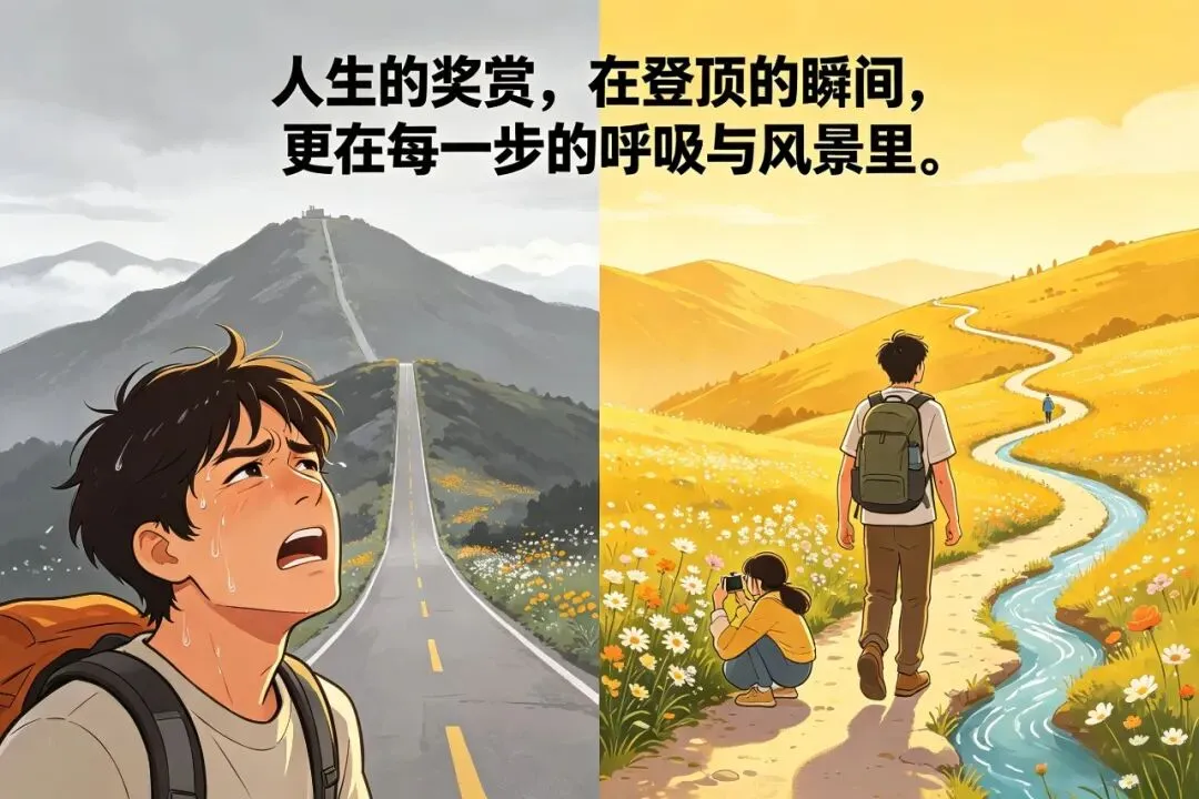 ●过程本身就成了奖励。 你不会只盯着那个遥远而模糊的“山顶”,你会为今天顺利通过一个难点、为途中发现的一朵野花、为一阵吹干汗水的清风而感到由衷的快乐。人生这场徒步,终点都一样。最重要的,是你以什么样的状态,体验了这整条路。