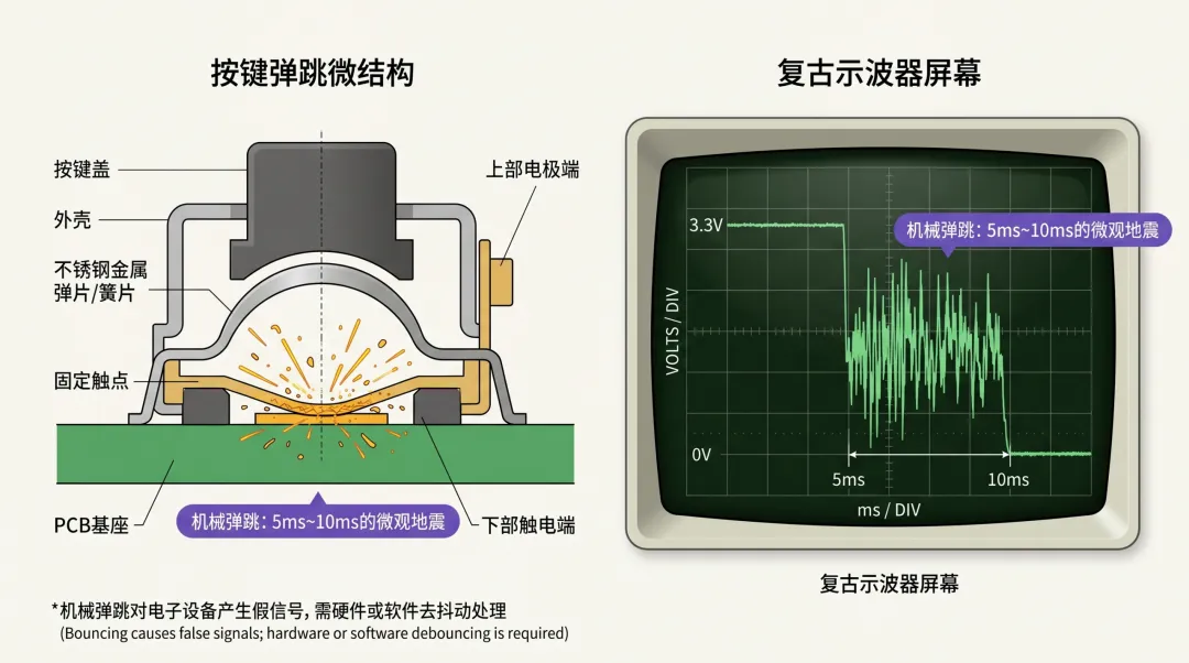 在 MCU 看来,你根本不是按了一下按键,你是在用一把加特林机枪,对着它的 GPIO 引脚疯狂扫射了上百个高低电平的脉冲。如果你的代码写的是“检测到下降沿就执行动作”,那么 MCU 就会忠实地在这一瞬间,把你的动作执行几十遍。
