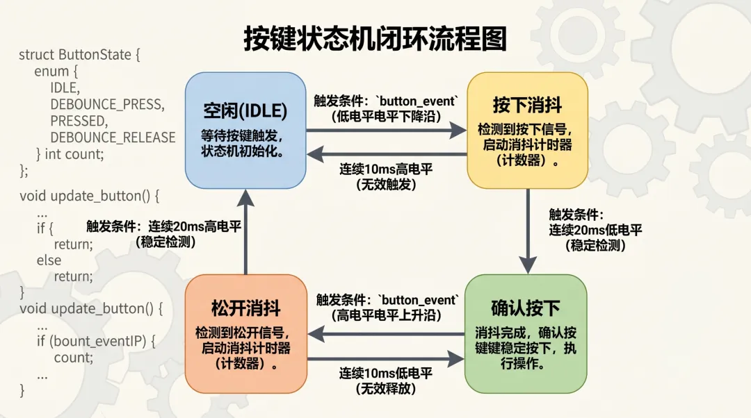 while死等的问题)。一旦引脚变高了,说明用户有松手的迹象,我们将状态切换为“状态 3”,并清零计时器。状态 3:松开抖动期(RELEASE_DEBOUNCE)和按下时一样,松开手指时,簧片同样会发生抖动!如果在计时器达到 20 毫秒之前,引脚又变低了,说明是簧片的抖动,我们把状态踢回“确认按下状态”。如果连读 20 毫秒都是高电平,说明弹片彻底静止,用户完全松开了手指。此时,触发“按键松开”事件,并将状态完美归位到“空闲状态”。