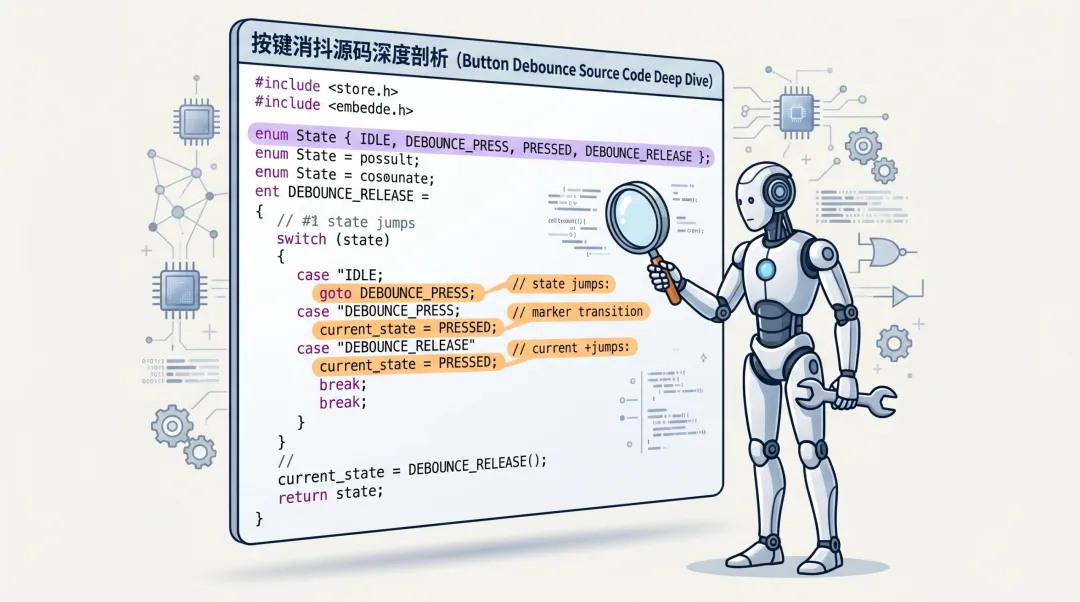 从物理层面上两片弹簧金属的粗暴碰撞,到 RC 模拟电路的温柔平滑;从施密特触发器果断的数字裁决,再到 C 语言有限状态机里精密运转的逻辑齿轮。