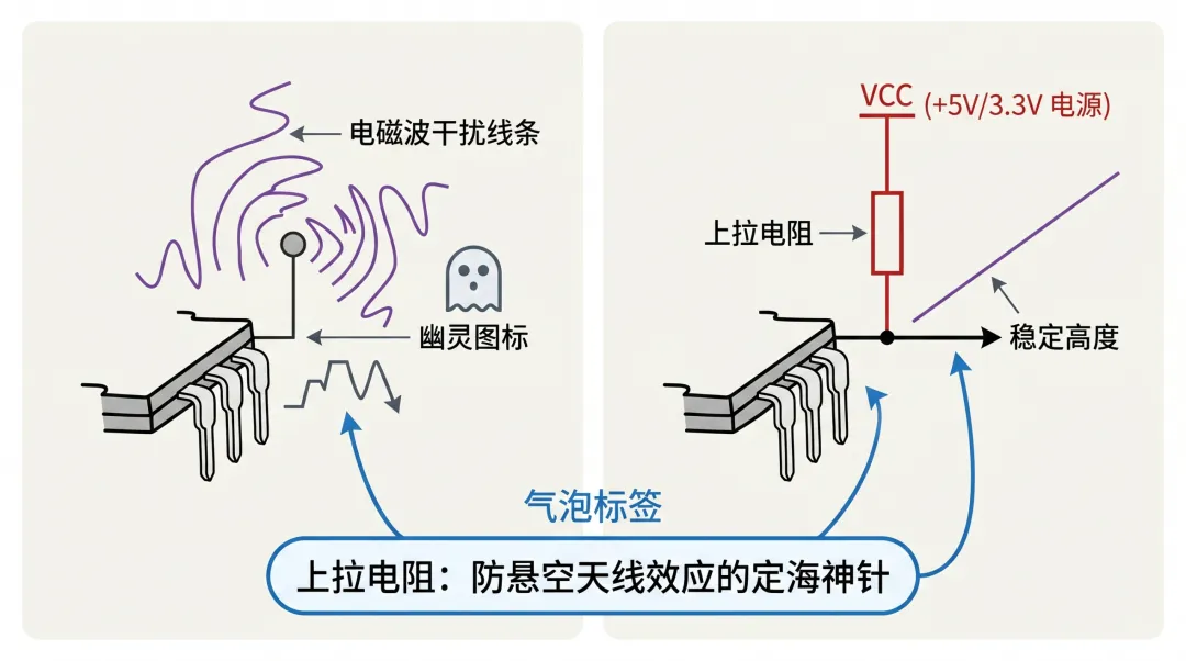 CMOS 芯片引脚的输入阻抗极大,如果处于“悬空”状态,这个引脚就像一根极其敏感的无线电天线,会捕捉空气中的工频干扰信号和空间电磁波。排坑指南: 必须在硬件电路上外接 10k 左右的上拉电阻,或者在软件初始化 GPIO 时,明确开启内部的弱上拉电阻(Pull-Up)。让引脚在默认状态下,被死死地“拉”向 3.3V 这个确定的电平。