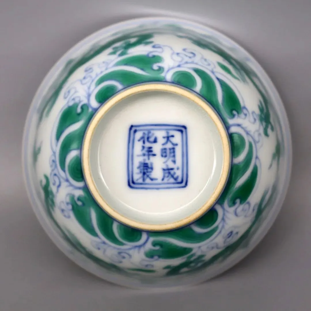 综合胎、釉、青花、彩料、纹饰、款识等核心特征,该器物与明代成化朝官窑斗彩绿龙纹碗标准器高度契合,确认为明代成化年间(1465-1487 年)景德镇御窑烧制的斗彩精品瓷,属明代成化官窑御用器上品范畴,为明代斗彩瓷巅峰之作。