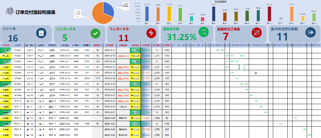 还有就是增加了可视化数据展示,大家可以从图中看到醒目的总订单数、已完成订单数、未完成订单数、整体交付率、逾期未交订单数、近30天交会订单数各是多少,这些都是根据我们录入的数据使用公式自动计算的,不需要我们手动干预。
