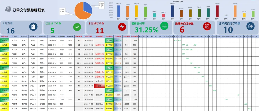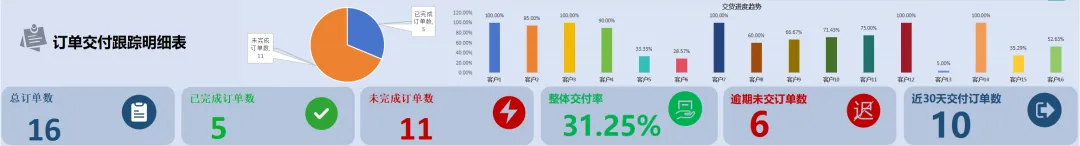 ✅进度图表可视化:顶部配套订单完成率饼图、客户交货进度趋势图、各类关键指标可视化。