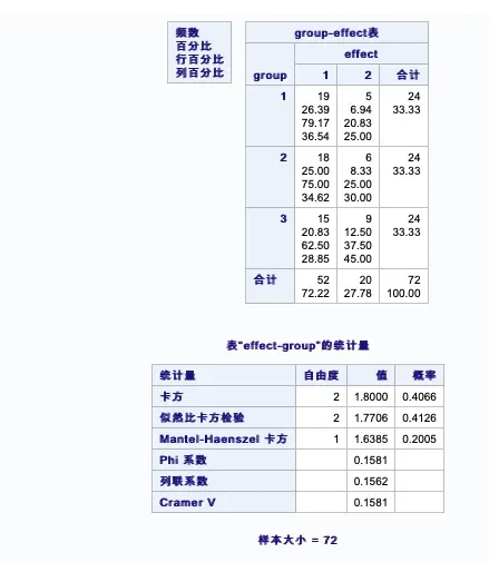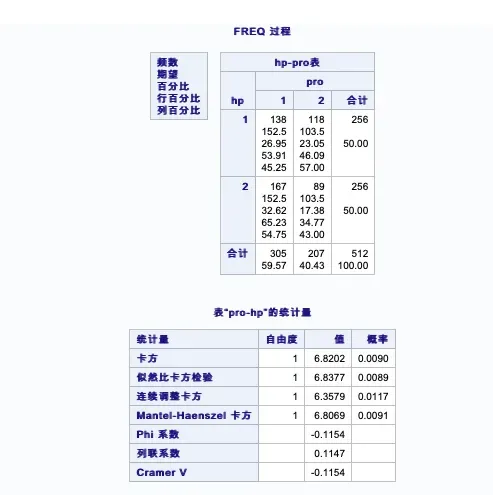 tables hp*pro/chisq expected; /* tables语句列出列联表,chisq选项调用卡方检验结果