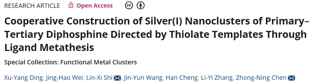 以上研究论文以“Cooperative Construction of Silver(I) Nanoclusters of Primary-Tertiary Diphosphine Directed by Thiolate Templates Through Ligand Metathesis”为题发表于 Aggregate 期刊,论文第一作者为中科院福建物质结构研究所的丁旭阳博士,通讯作者为中科院福建物质结构研究所陈忠宁研究员和施林熙工程师。
