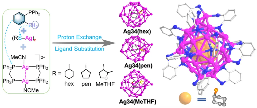 针对上述问题,本工作提出了一种新型保护配体—伯-叔双膦配体(2-Ph2PC6H4PH2),并创新性地开发了基于配体交换与质子交换协同作用的“双交换”合成策略(图1)。利用该策略,成功制备出三种结构高度相似的Ag34纳米团簇。值得关注的是,在这些Ag34纳米团簇中,硫醇盐(RS−)突破了传统上仅作为保护配体的角色,而是直接作为结构模板嵌入Ag34金属内核。Ag34纳米团簇内核为由34个Ag+原子构筑的“鹰嘴豆状”金属壳层,并通过脱质子后的伯-叔双膦配体(2-Ph2PC6H4P2−)的多重桥连作用(μ4/μ5),形成稳定的Ag4/Ag5多面体单元。这一结构特征为团簇球壳结构的构筑与热力学稳定性的显著提升奠定了坚实基础。