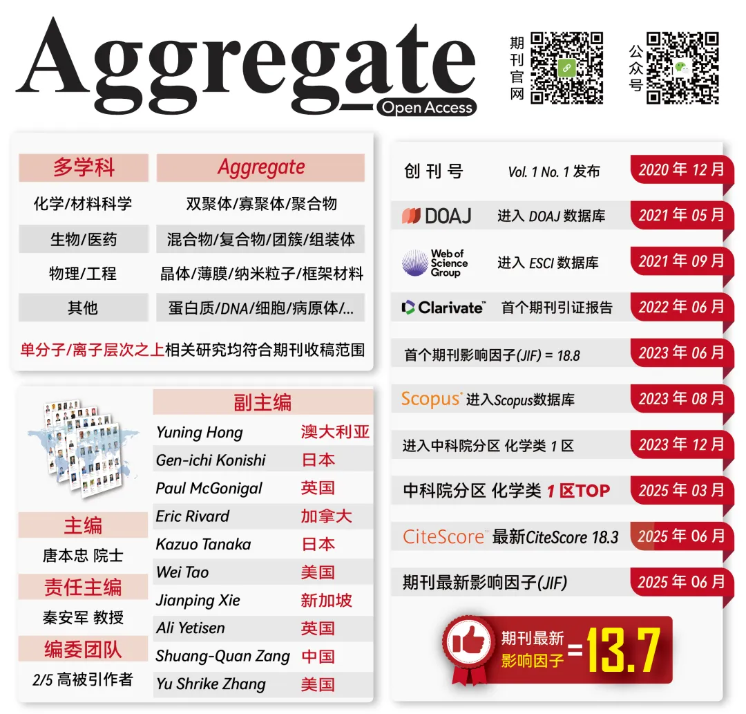 Aggregate 在科睿唯安发布的期刊引证报告(JCR)中,连续四年位列“化学:综合”,“物理化学”和“材料科学:综合”三个学科Q1区,期刊最新影响因子为13.7;在2025年中国科学院文献情报中心期刊分区表中,位列化学大类一区TOP,并进入三个小类一区!