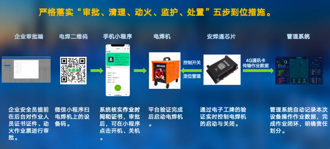 依托物联网、大数据、人工智能等现代信息技术,建设动火作业电焊安全生产风险监测预警系统,实现“用芯管机,用机控工,用智安焊”,可全面破解传统监管难题,对电焊作业全链条、全要素、全过程进行智能化管控,全方位提升安全保障能力。
