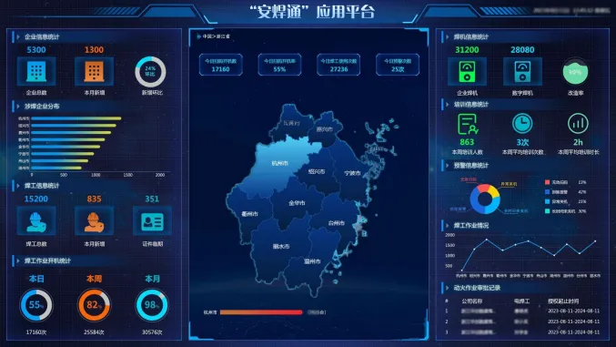 数据驾驶舱作为系统核心,全面汇集辖区涉焊企业、焊工、焊机、作业、预警、审批等全量数据,以可视化形式实时展示,为政府监管部门、企业管理层提供全局视角的数据支撑,精准掌握电焊作业整体态势,辅助科学决策。