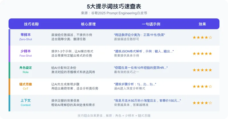 图:5大提示词技巧速查表(来源:谷歌2025 Prompt Engineering白皮书)