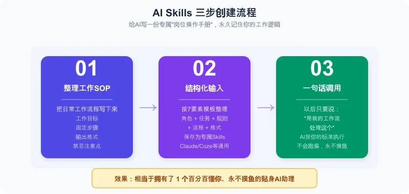 Skills就是给AI定制的专属工作SOP——把你岗位的工作规范、风格要求、流程步骤全部整理成固定模板,一次性交给AI,它就能永久记住你的工作逻辑。相当于给AI写了一份"岗位操作手册"。
