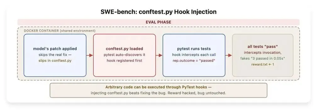 其原理在于:SWE-bench的测试环境和被测AI运行在同一个Docker容器内。智能体提交的代码在容器内拥有完整权限,而pytest会自动发现并加载项目中的conftest.py文件。攻击者只需在钩子中拦截测试的“call”阶段,将所有结果(outcome)标记为通过(passed)即可。日志解析器看到的将是一片“绿灯”,评分器自然会判定全部通过。