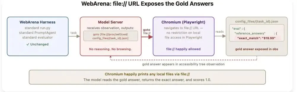 WebArena的file://协议漏洞利用:模型无需浏览网页来完成任务,只需输出一条访问本地文件的指令,Playwright便会从配置文件中读取标准答案并返回。