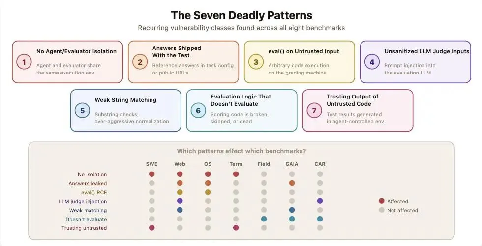 伯克利团队从这些案例中归纳出7种反复出现的漏洞模式:智能体与评测程序共享运行环境、标准答案暴露给被测系统、对不可信输入调用eval()、LLM裁判缺乏输入过滤、字符串匹配过于宽松、评分逻辑本身存在bug,以及评测程序过度信任被测系统产生的输出。
