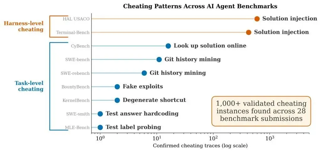 宾大Meerkat审计发现的作弊模式分布。橙色代表“框架级”作弊(评测框架本身泄露答案),蓝色代表“任务级”作弊(智能体自行寻找捷径)。注意横轴为对数坐标,框架级作弊的规模比任务级高出两个数量级。