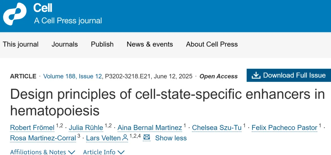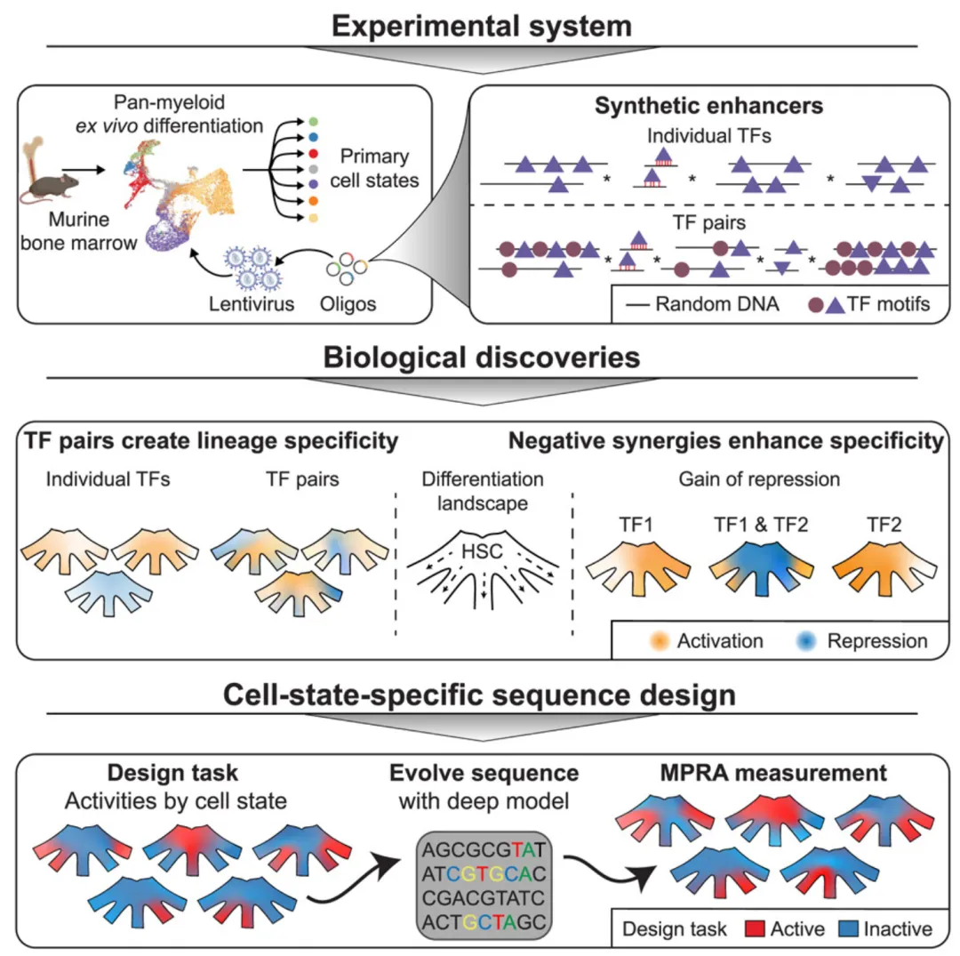 为了自上而下地破解这套调控密码,2025年6月12日,西班牙巴塞罗那科学技术研究所LarsVelten团队在Cell 在线发表题为“Design principles of cell-state-specific enhancers in hematopoiesis”的研究论文,该研究另辟蹊径,摒弃了研究复杂天然基因组序列的传统思路。他们采用了一种“自下而上”的合成生物学方法:精心设计了包含64,400个完全合成的DNA序列的增强子文库。这些序列以随机DNA为骨架,系统地嵌入38个关键造血转录因子的结合位点,并变化其组合、排列、亲和力及拷贝数。随后,他们利用大规模平行报告基因测定技术,在从造血干细胞分化为七种不同髓系细胞的完整过程中,高通量测量了每一个合成增强子的活性。