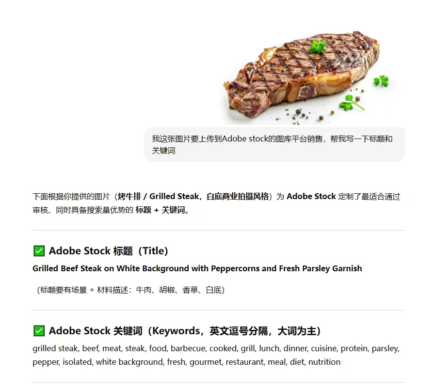 图片做好之后,不是直接上传,还差一个关键动作:写标题和关键词。这里不用自己想,直接把图片丢给ChatGPT,但不要完全照搬,AI给的关键词不一定完整,你可以稍微筛选一下,把不相关的删掉,再补几个更贴近图片内容的词。这个地方其实决定你能不能被搜索到,很多人做了图却没流量,就是卡在这里。