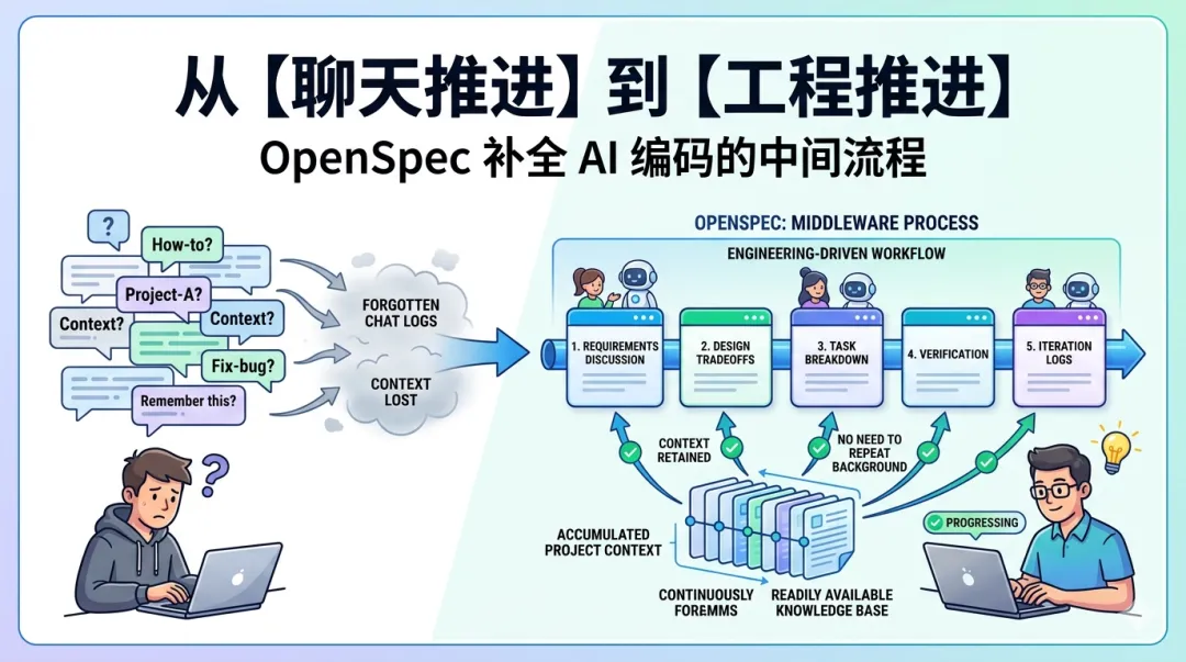 简单说,OpenSpec 是一套把 AI 编码从“聊天推进”改成“工程推进”的中间流程。