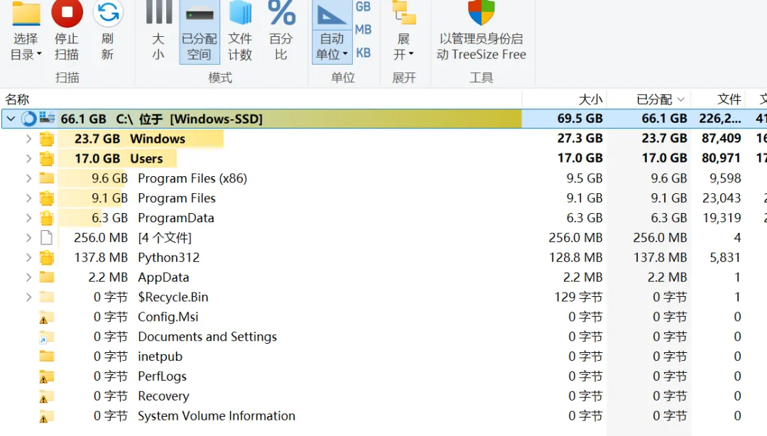 不过要特别提醒一下:运行TreeSize时,建议右键点击图标选择“以管理员身份运行”。这样才能完整扫描包括系统卷信息在内的全部系统文件夹,否则C盘里的隐藏“大胃王”是扫不出来的。