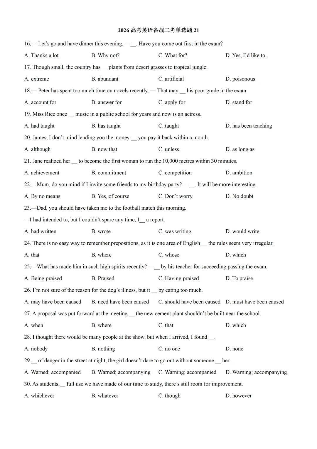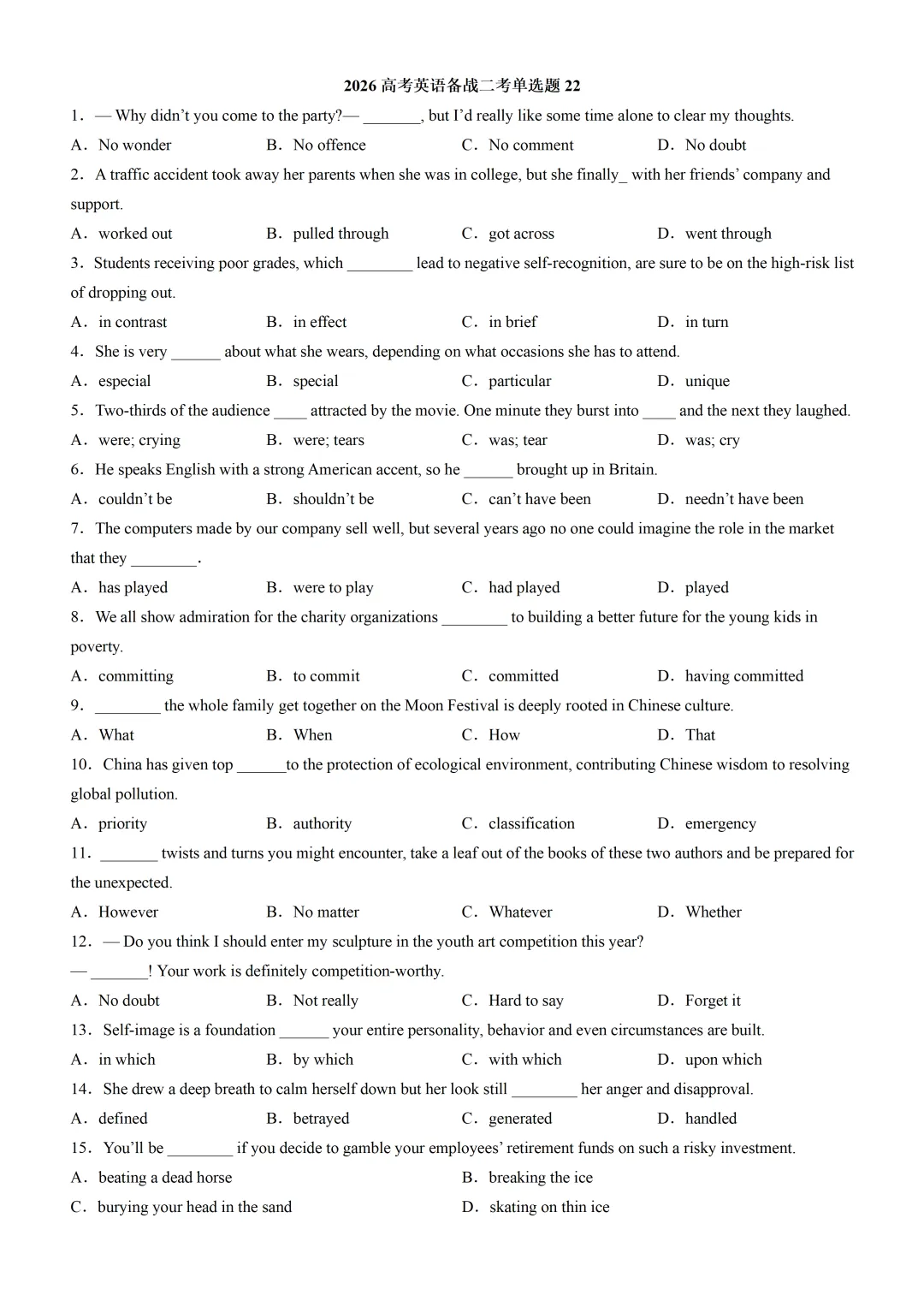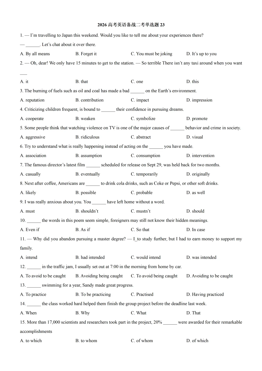 【可下载】2026届高三英语单选题10套专项训练三(150题)点击上方“蓝字”免费关注!完整版试卷+答案下载入口关注“卿卿侃古今”公众号点击左下角阅读原文可下载相关链接:2007-2025年天津市高考英语真题汇总(持续更新中~)2011-2023年天津高考英语听力真题在线测试【高考英语听力在线测试】高考听力机考模拟试题大全(持续更新中)【可下载】2025-2026年高中英语试题汇总(附解析)【持续更新中】【汇总】高中英语月考和期中期末试题(持续更新中~)【题库】高一英语试题汇编(持续更新中~)【题库】高二英语试题汇编(持续更新中~)【题库】高三英语试题汇编(持续更新中~)【可下载】高三英语上学期期末试题16套(附解析)【可下载】高二英语上学期期末试题10套(附解析)【可下载】高一英语上学期期末试题汇9套(附解析)【可下载】2025-2026学年度高一高二高三开学考试模拟试卷(天津专用)(附解析)新外研版高中英语高清电子课本、课文原文和译文、单元同步复习资料和试题【持续更新中】【目录1】高中英语阅读理解限时训练大全(持续更新中~)【目录2】高中英语完形填空限时训练大全(持续更新中~)【目录3】高中英语书面表达大全(持续更新中~)【目录4】高中英语听力训练大全(持续更新中~)【目录5】高中英语单选题大全(持续更新中~)【目录6】高中英语语法题大全(持续更新中~)【目录7】高中英语阅读表达题大全(持续更新中~)【目录8】科普知识汇总【目录9】中高考学法知识汇总【目录10】高考英语真题+名校模拟真题+月考和期中期末试题(持续更新中~)【目录11】暑期高考英语备考资料大全持续更新中~【汇总】中高考志愿填报资料大全【汇总】高中英语月考和期中期末试题(持续更新中~)【汇总】2025届高三英语一模试题(附解析)【汇总】2024届高三英语一模二模三模试题(附解析)【汇总】2024届高考英语押题卷(附解析)【汇总】2025届高三英语周考综合练(附解析)【题库】高三英语限时训练(持续更新中~)【模拟】2025届高三英语听力机考模拟试题在线测试【高考词汇】(新)外研版高中英语全七册词汇表(附音频)【中考词汇】初中英语外研版必备单词表(完整版),可打印 建议收藏保存点击阅读原文查更多