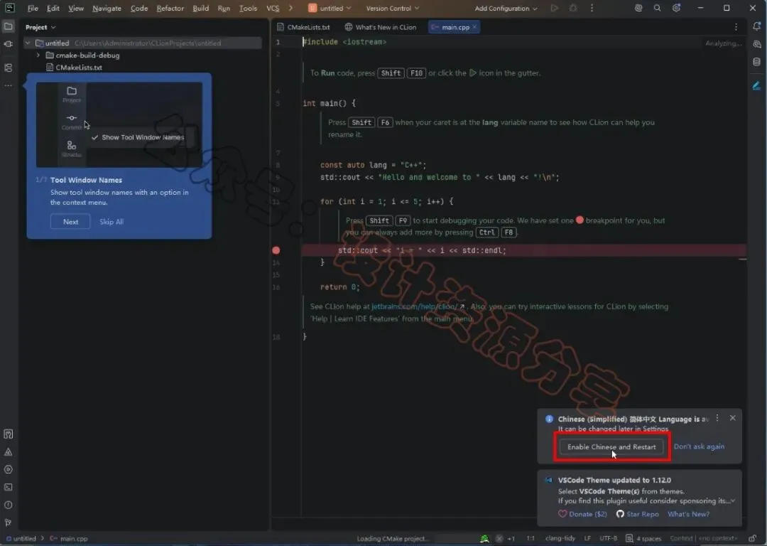 14、点击【Enable Chinese and Restart】17、以上就是CLion 2026软件安装的全过程,要是对你有帮助的话,请为小编点个赞!