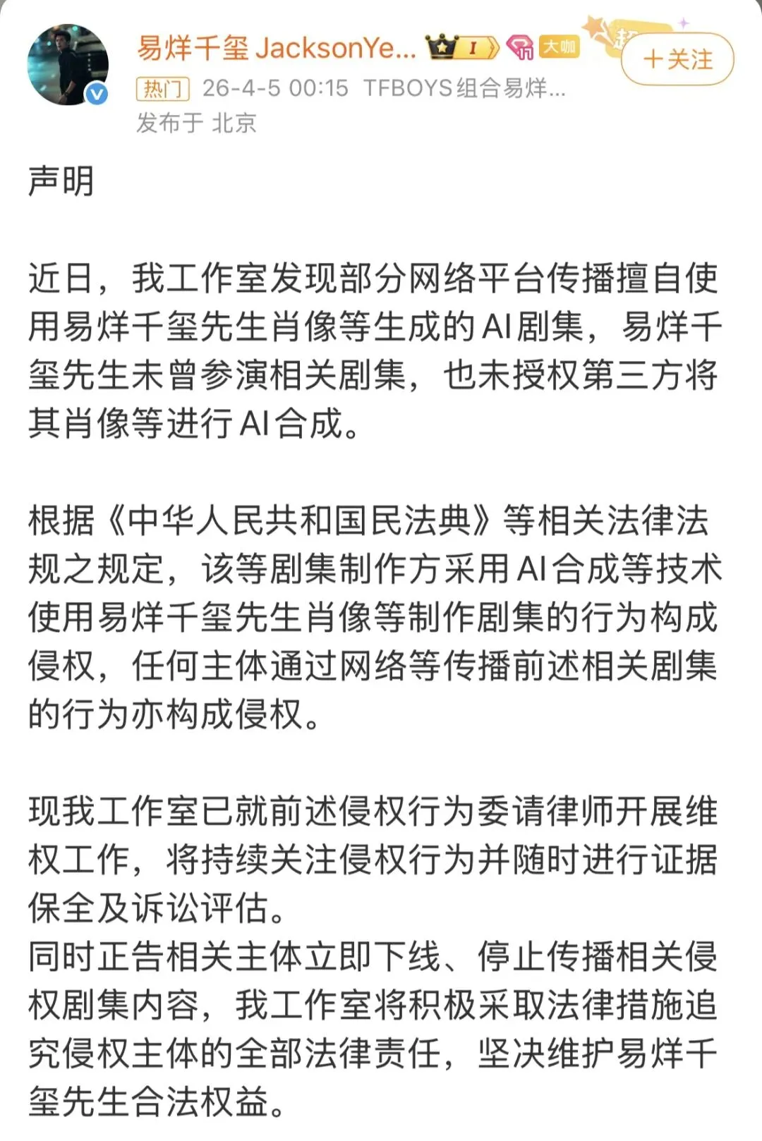 超过十位顶流艺人,密集发布严正声明,斥责AI短剧平台盗用肖像权。