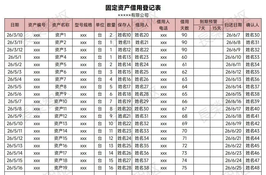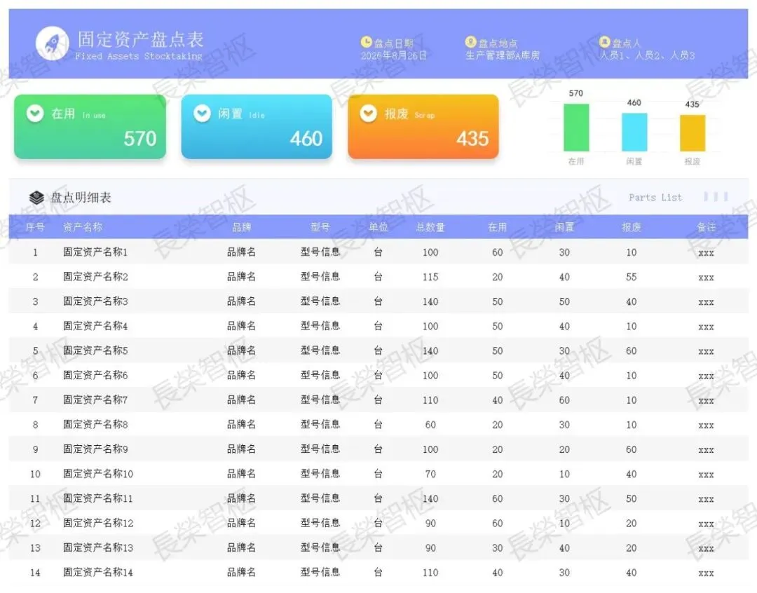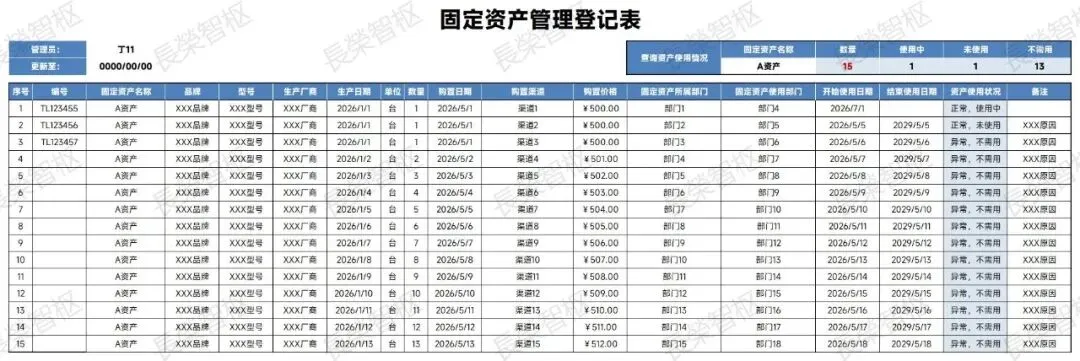 整套模板覆盖登记、管理、盘点、折旧、借用、转移、报废、标签打印全场景,适合中小企业、行政部、财务部直接使用,省去大量制表时间,工作更规范高效。