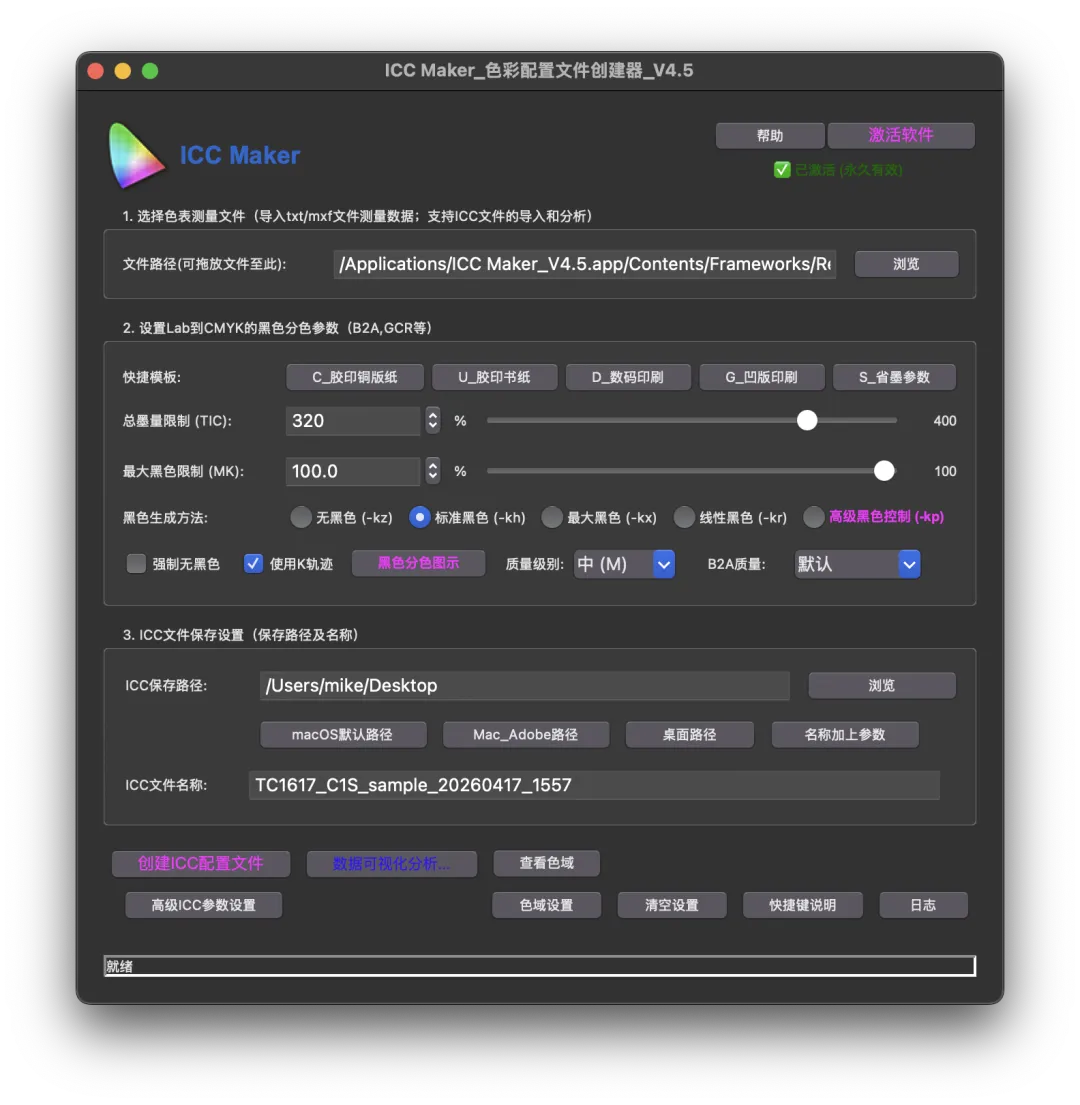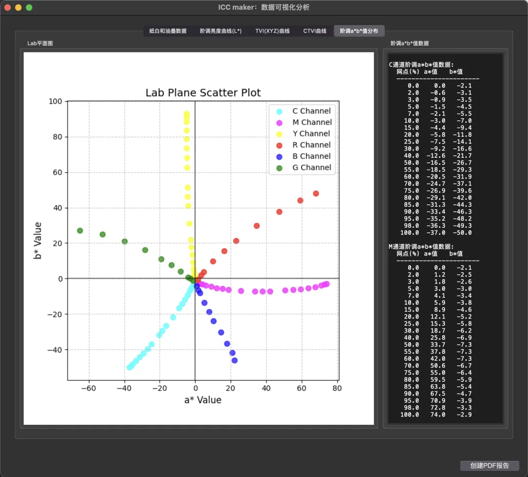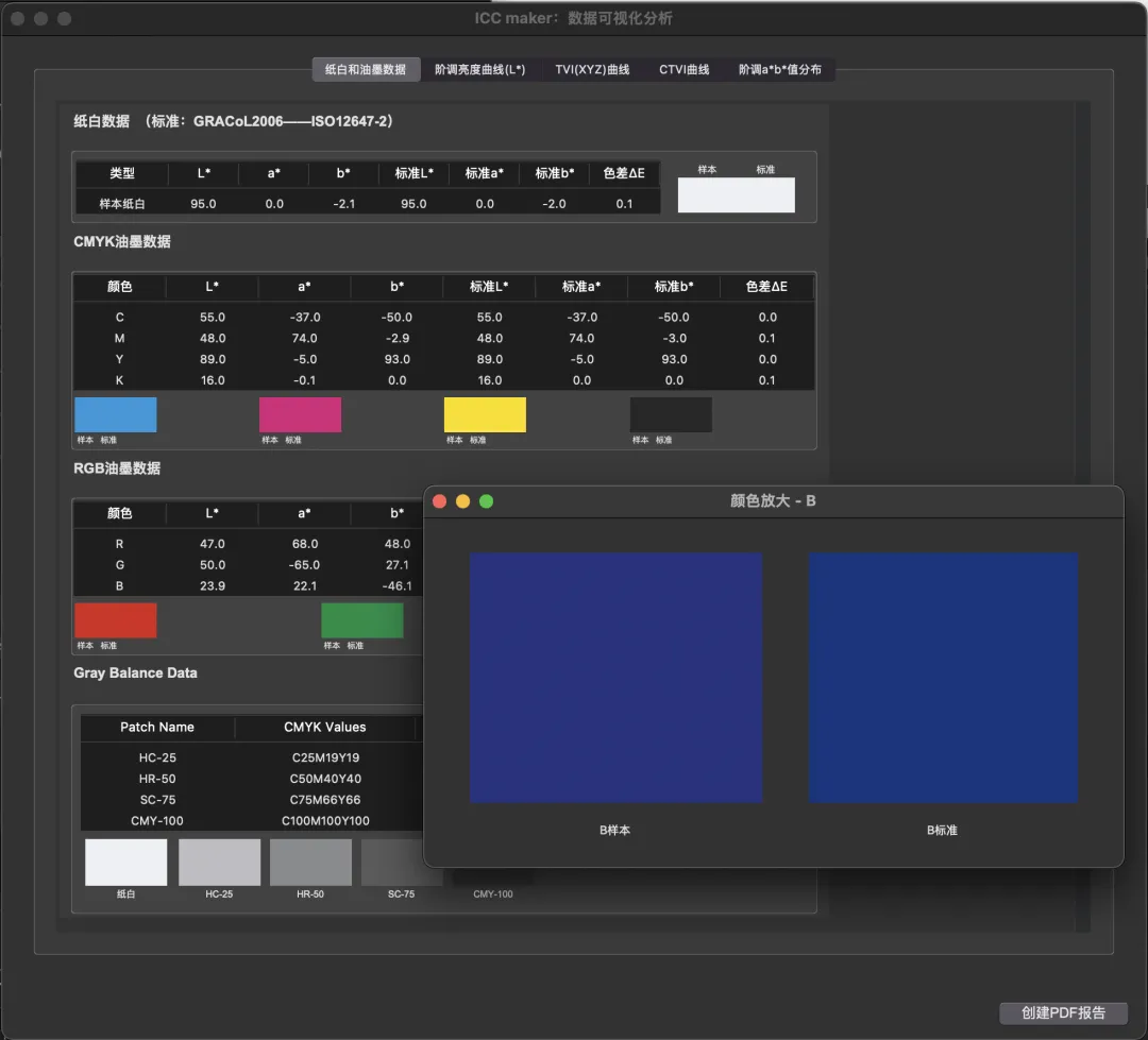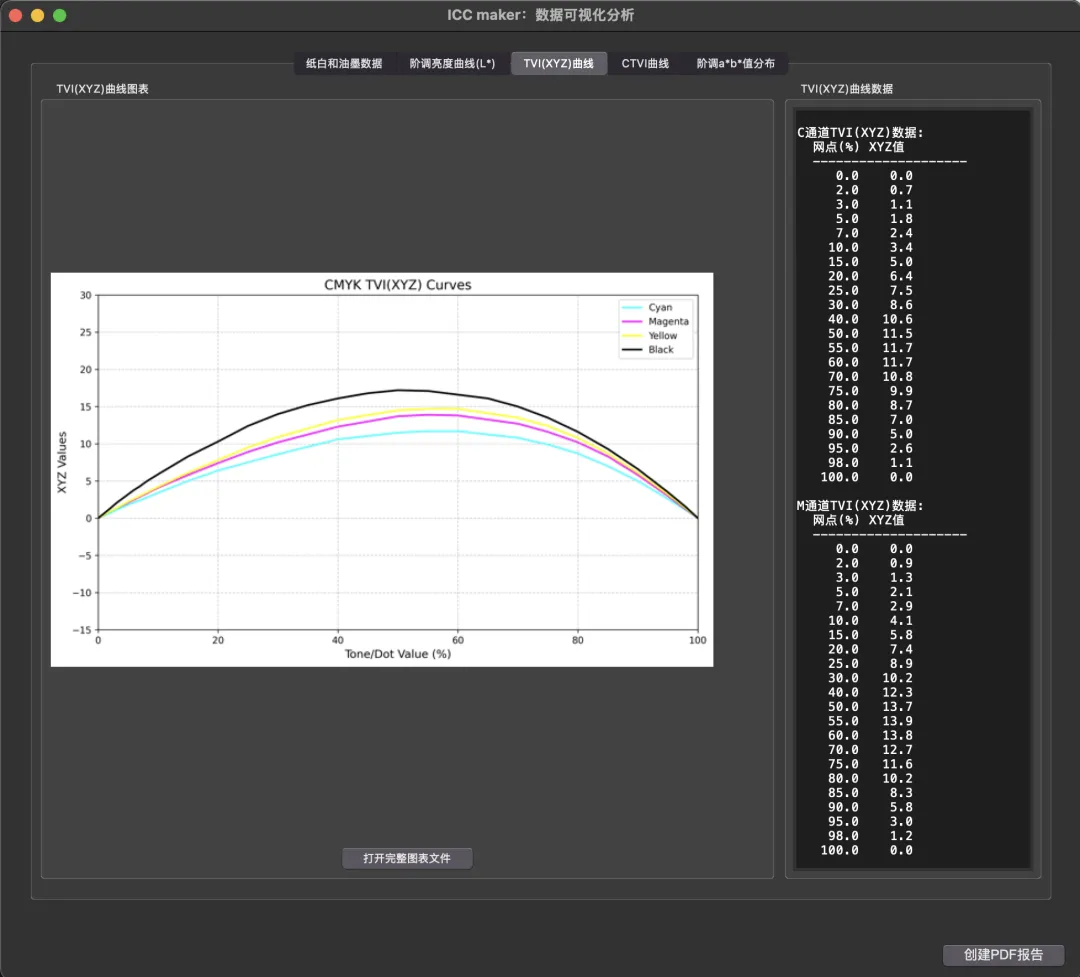 提取txt测量数据或ICC文件的纸白、实地和叠印、灰平衡数据; 分析TVI、CTV数据、CMYRGB阶调ab值分布; 创建测量数据或ICC分析PDF报告; 查看色域图(线框图,实体图); 设置分色参数,创建新的ICC配置文件; 系统支持: MacOS 11.7、15.7、12(Tahoe),Windows 7~11。 *其他系统版本暂未测试,intel Mac尚未更新到最新版本(可适配)