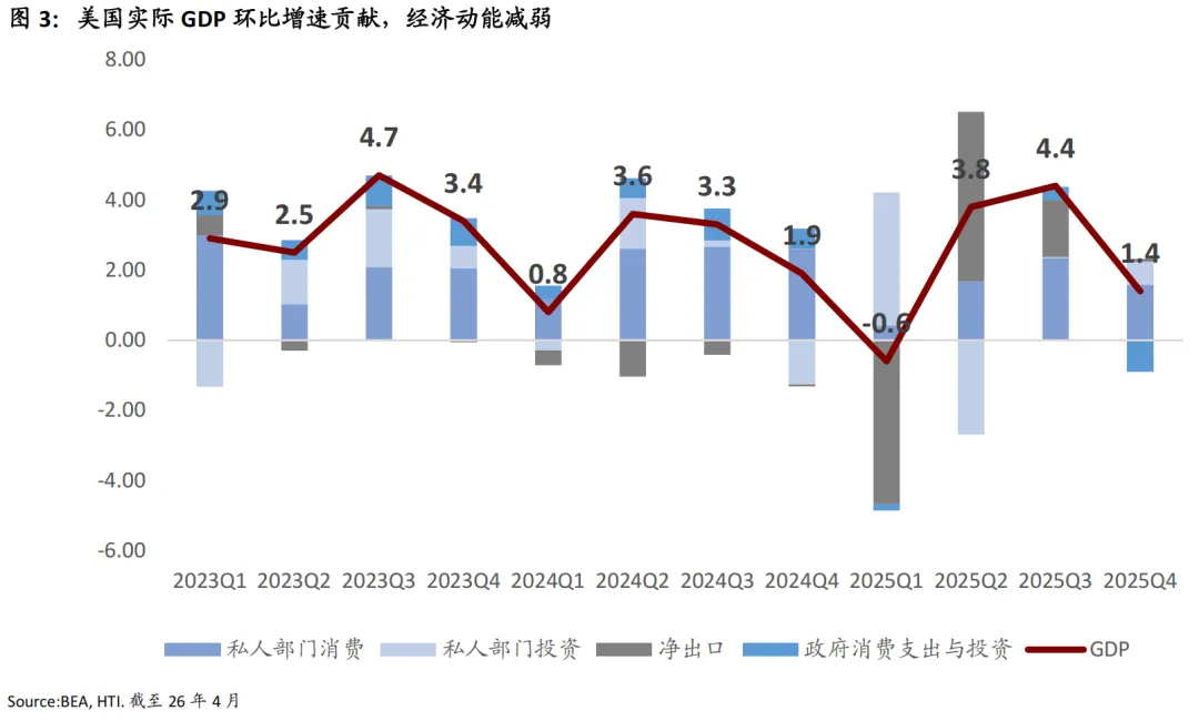 尽管宏观环境动荡,美国经济仍表现出超预期的韧性,目前正平稳跨入一个增速更具可持续性、更符合长期均衡水平的过渡区间。我们认为美国经济已规避了此前的衰退风险,正在向 2% 左右的潜在增长率趋近。虽然早期的财政刺激红利已经逐步消退,但目前未看到明显的结构性衰退信号,而更像是软着陆后的平稳飞行。