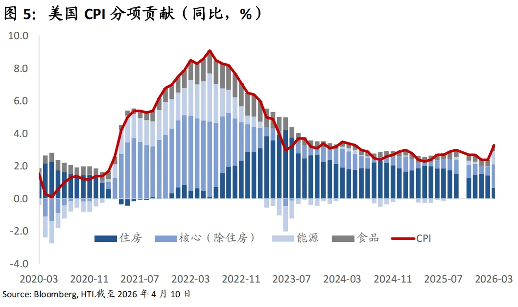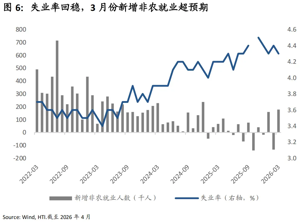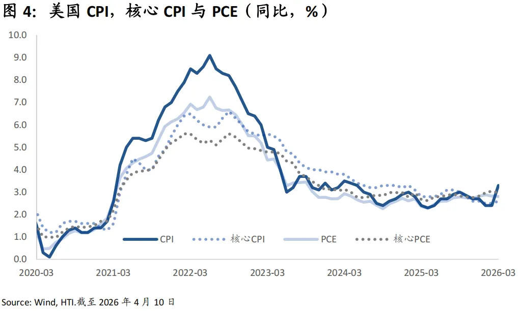 通胀方面,我们保持谨慎乐观。3月CPI季调后环比上涨0.9%,同比上涨3.3%;核心CPI环比上涨0.2%,同比上涨2.6%。具体来看,此次通胀数据呈现分化:能源价格大幅上涨,带动整体CPI走高,高油价已经开始推升机票价格及消费者通胀预期。相比之下,核心CPI整体温和,劳动力市场放缓,叠加消费需求偏弱,抑制了物价全面上涨。我们认为通胀的大趋势整体温和向下,但由于住房成本和劳动力密集型服务业的粘性,通胀最终回到2%的目标的过程将比市场预期更长。