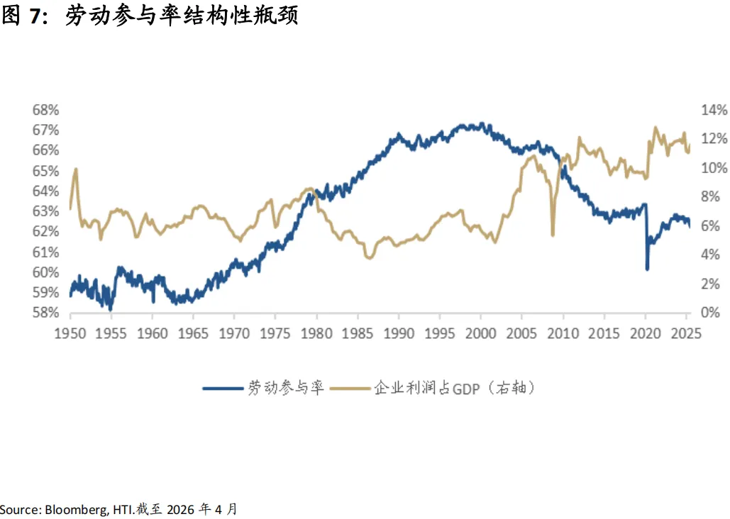 就业方面,我们更关注供给侧而非需求侧,由于人口老龄化和劳动参与率的结构性瓶颈,美国就业市场或将长期保持相对偏紧的状态,即便招聘需求放缓,企业在裁员方面也会非常谨慎(Labor Hoarding,劳动力囤积),这为经济提供了一个稳定的支撑。