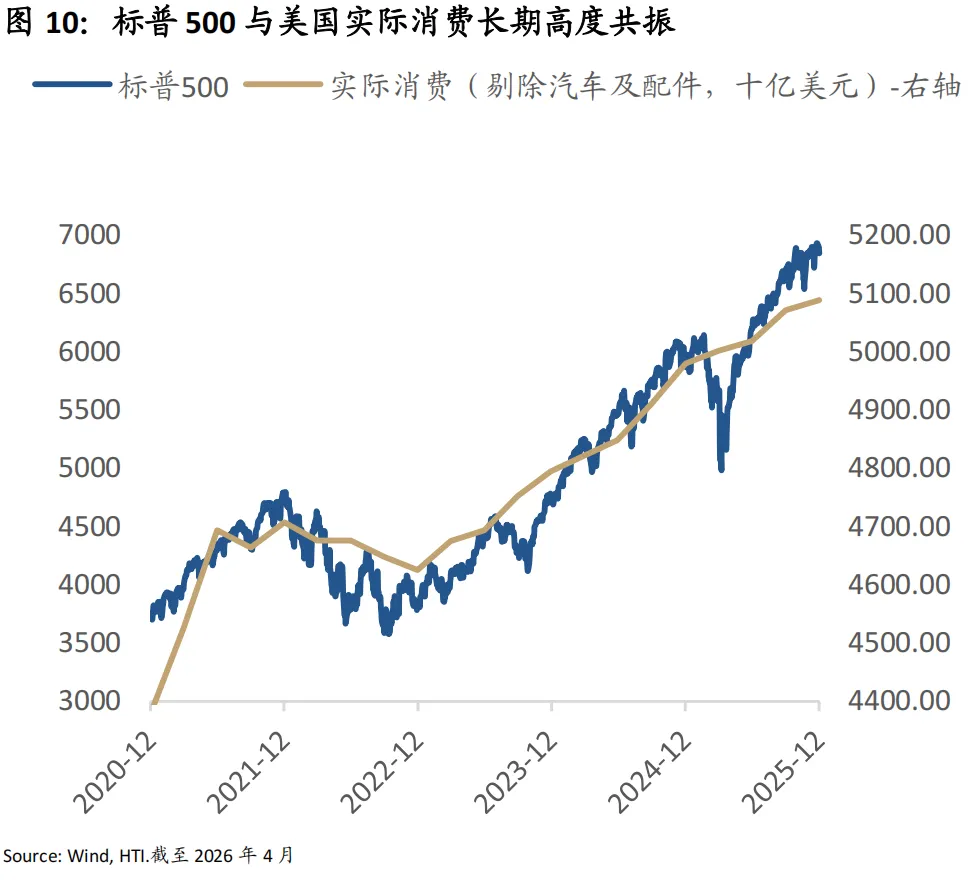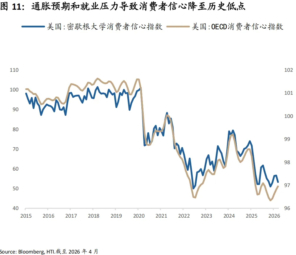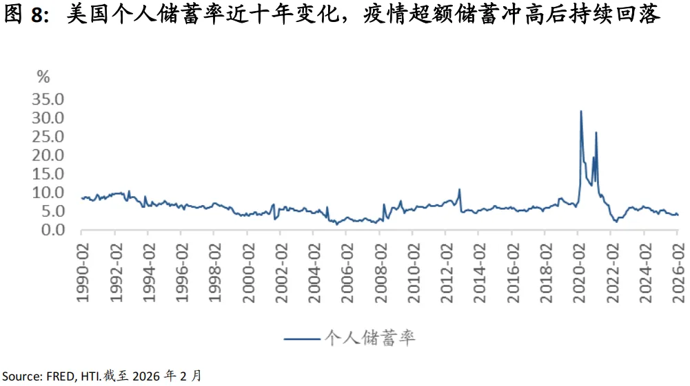 消费依然是美国经济的支柱,但存在动力切换和杠杆压力现象。目前超额储蓄已基本耗尽,消费者正越来越依赖薪资增长而非政府补贴,高利率环境开始通过信贷收缩作用于实体消费,在利息负担加重下,消费支出正从前期的补偿性增长转向更为审慎的纪律性扩张。