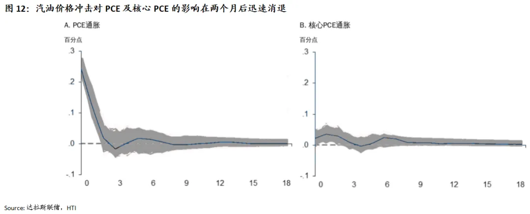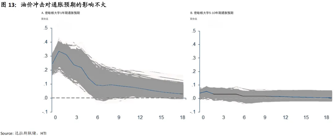 根据达拉斯联储结构向量自回归模型测算,油价冲击对长期通胀预期影响有限,通胀传导仅集中在直接能源分项汽油上,对核心通胀与长期通胀预期几乎没有影响。