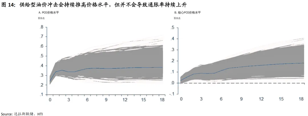 总体来看,只有当通胀走弱成为市场共识,情景二下的降息才具备可行性,否则,内部僵局可能导致4.2%左右的利率维持更久。达拉斯联储的研究表明,供给型油价冲击或对通胀中长期影响有限。