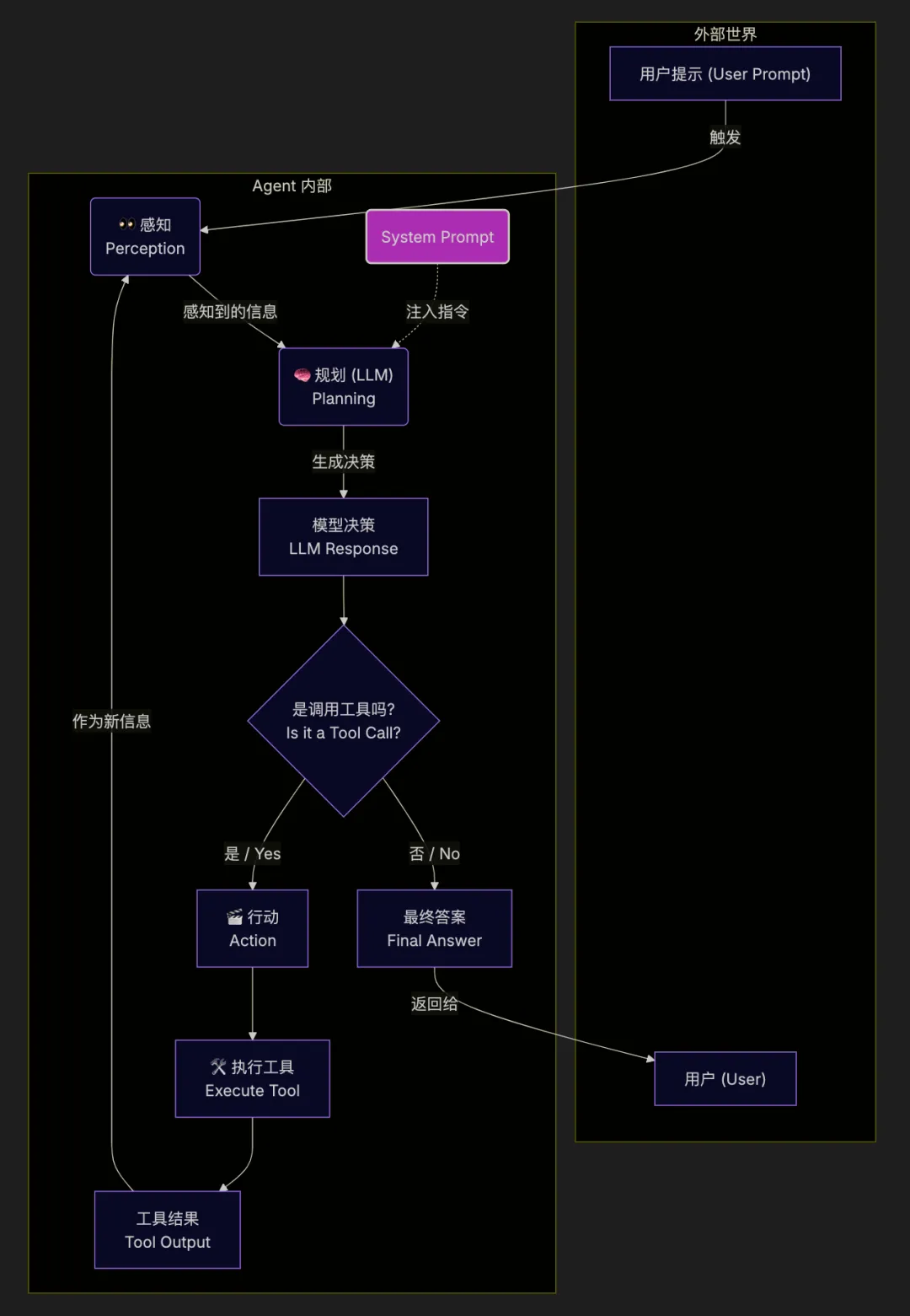 System Prompt: 为 Agent 定义了 🎯 目标,预设了 🧠 规划 的蓝图和 🎬 行动 的工具清单。 用户提示: 作为外部指令,被 Agent 的 👀 感知 模块捕获。 模型返回: 是 🧠 规划 模块的输出,它可能是一个最终答案,也可能是一个调用工具的决策。 工具: 是 🎬 行动 的具体体现,其返回结果会再次被 👀 感知 模块捕获,形成循环。