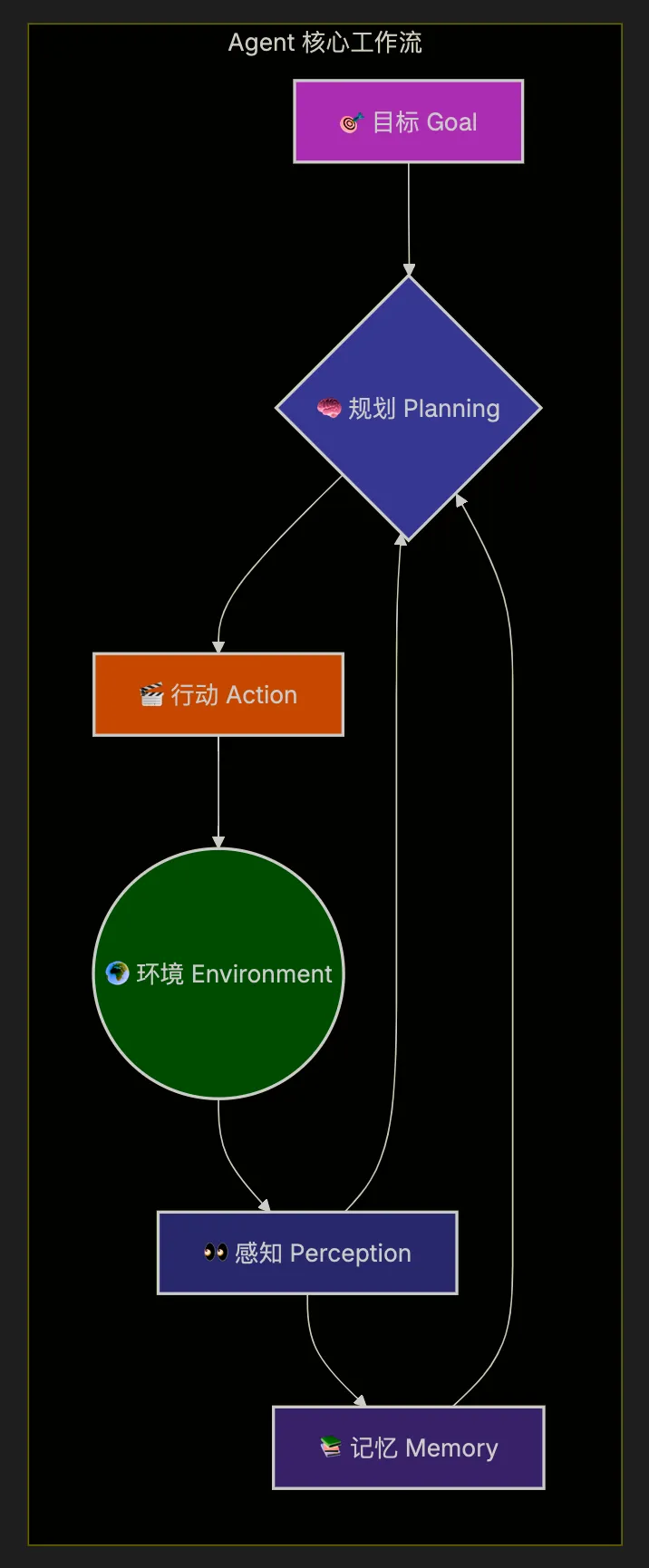 这张图清晰地描绘了 Agent 著名的 ReAct (Reason + Act) 循环:思考 -> 行动 -> 观察 -> 再思考...