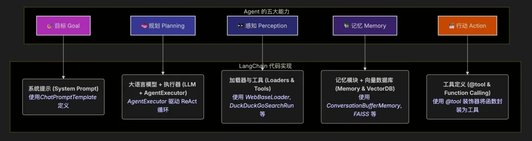 下面这张图表将五大核心能力与 LangChain 生态中的具体代码实现联系起来,帮助你更直观地理解如何在代码中构建一个 Agent: