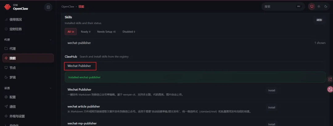 在 OpenClaw 的插件市场搜索「WeChat Publisher」,点击安装即可。