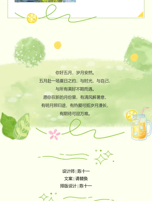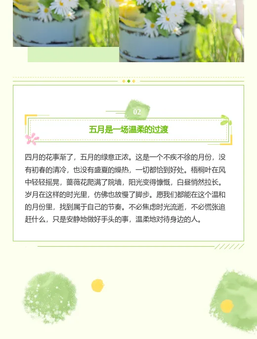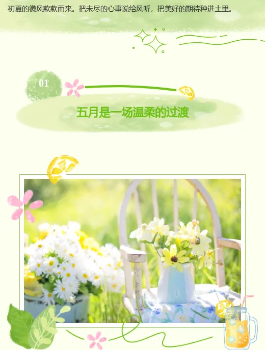 开头加一句五月相关的引语(比如"五月的风带着花香")