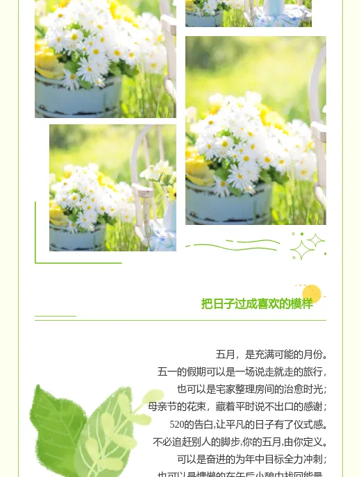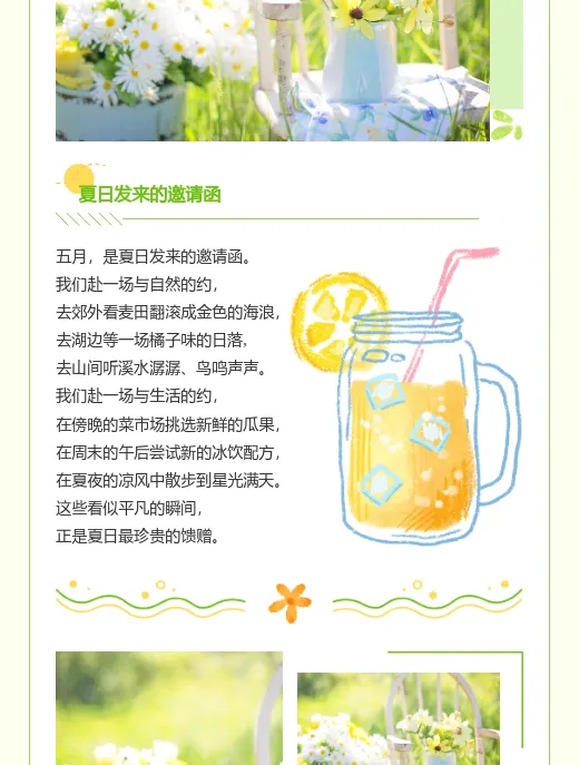 要是你正为找不到风格独特又免费的微信公众号排版模板而发愁,那可真是太煎熬了!当下为公众号挑选一个合适的模板并不容易,不过今天咱们就来揭秘一个超棒的公众号排版神器,它有很受欢迎的笔刷风格,还融入了五月的花朵、线条、圆点、柠檬水、叶子等元素。你要是想深入了解其中的巧妙之处,能发现更多惊喜哦。要是你正为找不到风格独特又免费的微信公众号排版模板而发愁,那可真是太煎熬了!当下为公众号挑选一个合适的模板并不容易,不过今天咱们就来揭秘一个超棒的公众号排版神器,它有很受欢迎的笔刷风格,还融入了五月的花朵、线条、圆点、柠檬水、叶子等元素。你要是想深入了解其中的巧妙之处,能发现更多惊喜哦。五月温柔风公众号模板使用步骤:
