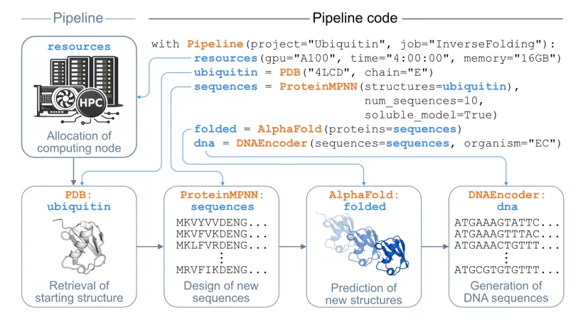 •执行逻辑:用户通过极简的类实验语法定义工作流节点与数据流转逻辑,框架自动生成执行脚本,无缝运行在Jupyter/Colab或SLURM超算集群,无需修改代码。