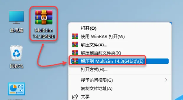 1.鼠标右击【Multisim 14.3(64bit)】压缩包(win11及以上统需先点击“显示更多选项”)选择【解压到 Multisim 14.3(64bit)】。