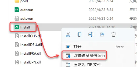 3.鼠标右击【Install】选择【以管理员的身份运行】。