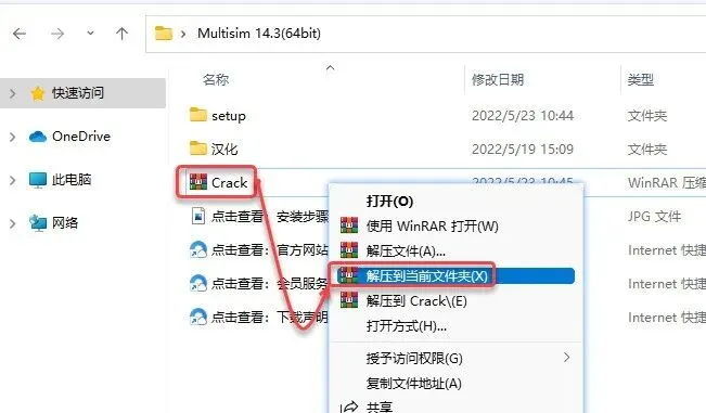 14.打开安装包解压后的【Multisim 14.3(64bit)】文件夹,鼠标右击【Crack】选择【解压到 当前文件夹】。