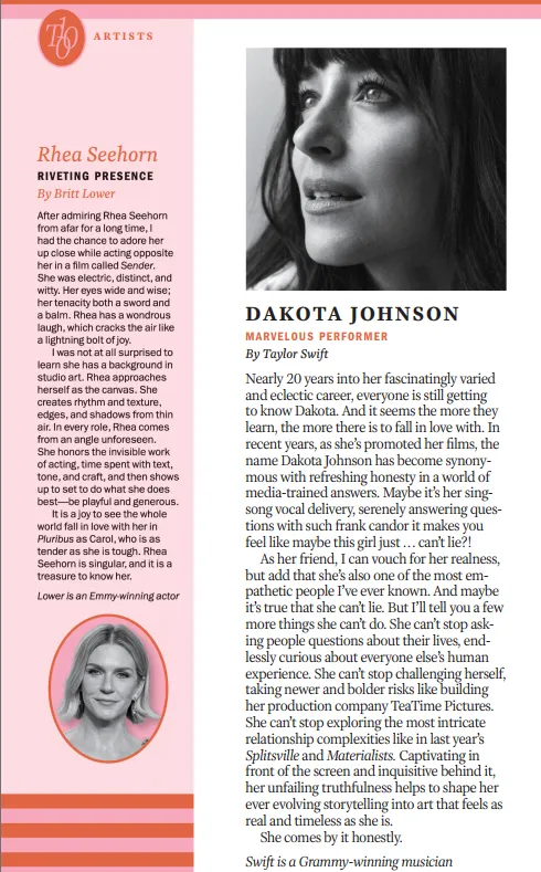 本期中有一篇是大家的英语老师——霉霉泰勒·斯威夫特(Taylor Swift)写的,介绍美国演员达科塔·约翰逊(Dakota Johnson)。她出演电影包括《社交网络》和《五十度灰》。