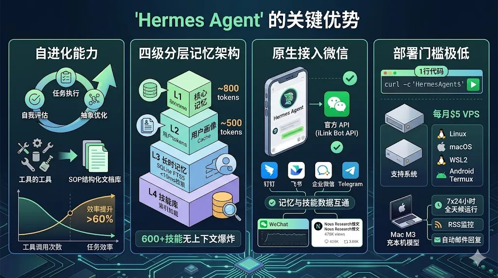 作为一个实际体验过Hermes Agent的人,我尽量客观地说说它的核心差异点。